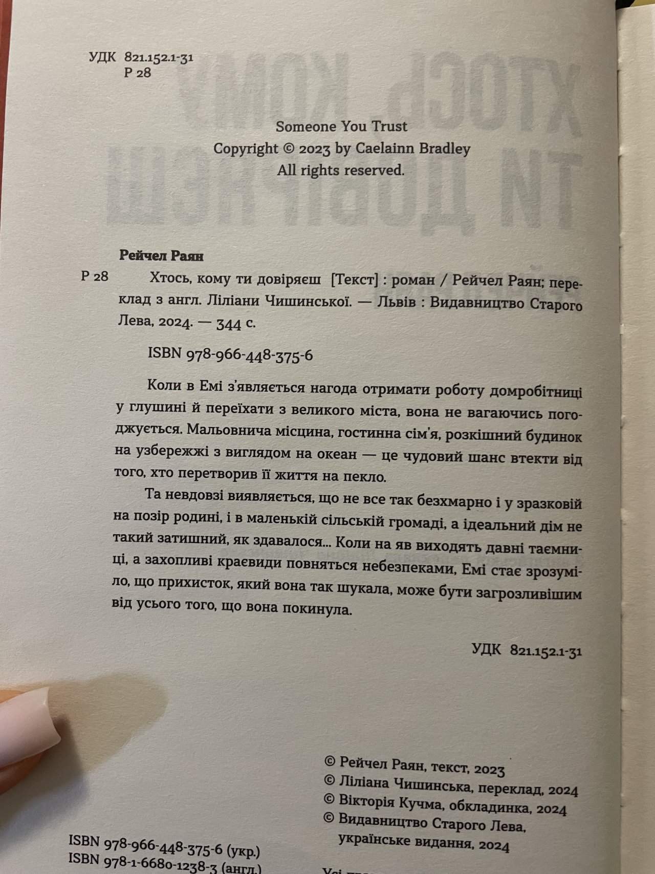Книга «Хтось, кому ти довіряєш» - це захопливий трилер про довіру, зраду та небезпечні секрети. Для тих, хто любить несподівані повороти сюжету та складних персонажів, ця книга стане чудовим вибором.