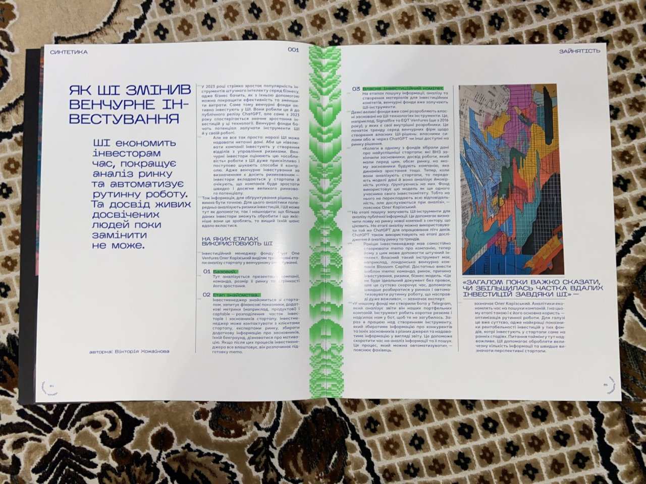 На культуру, гроші, здоров’я, на наші small talks з колегами та на глобальні уявлення про майбутнє. «Синтетика» підіймає актуальні теми зі світу інновацій та вільно розглядає їх з різних куточків зору: від світоглядних питань до побутових дрібниць. Перший номер «Синтетики» присвячений нейромережам та штучному інтелекту.