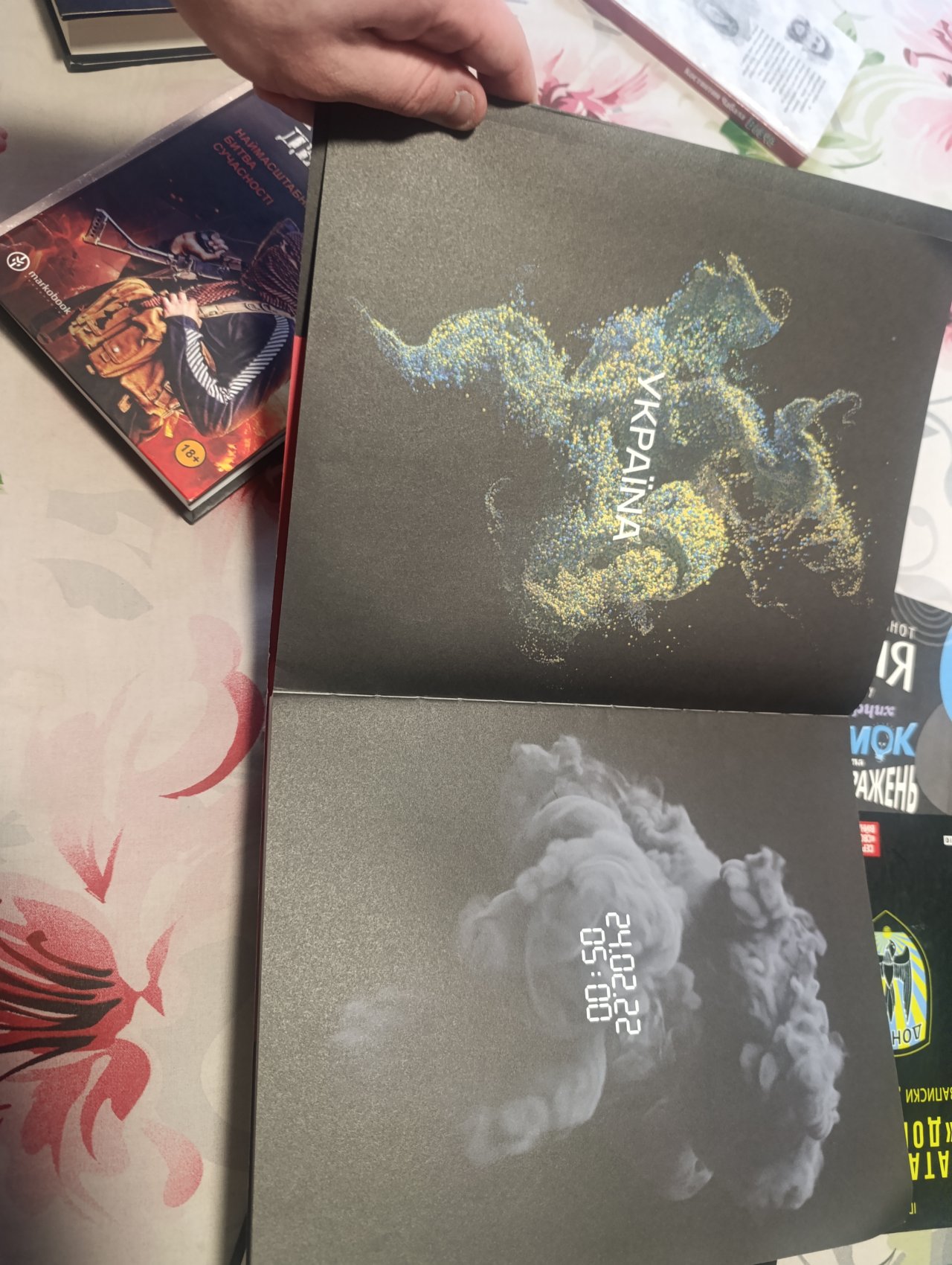 У журналі ви знайдете чимало атрибутів війни. Вибухи й дим, перетини блок-постів між розділами. Нумерація сторінок, що починається з 05:00 24 лютого, коли люди почали прокидатися від вибухів по всій країні. Повітряні тривоги, світломаскування, шрифти, що стрілочкою вказує де укриття.