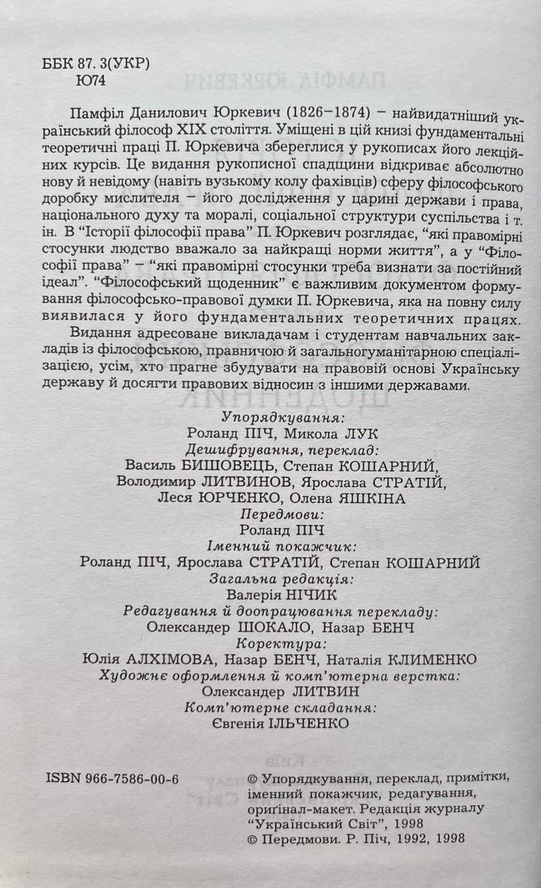 Юркевич Памфіл. Історія філософії права. Філософія права. Філософський щоденник