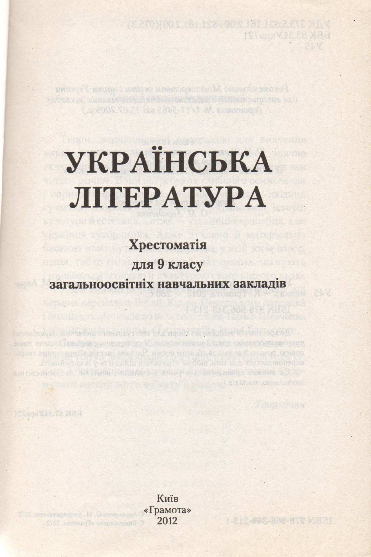 Хрестоматія з української літератури для 9 класу загальноосвітніх навчальних закладів.